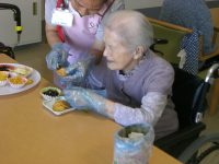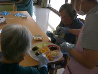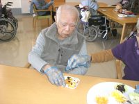 こんにちは、デイサービスです。今日はフラワーアレンジメントを行いました。お花屋さんから届いたお花は黄色のガーベラと紫色のリンドウです。施設敷地内の葉っぱも使用して取り組んでいただきました。ポイントは枝を短く切ることだそうです(*^_^*)お花を活け終わったあとはお好きな色のカラー包装紙とリボンで可愛らしくアレンジして完成です。「〇〇さんのは素敵ね。」「△△さんはセンスがいいわね。」等、完成作品をお互いで褒め合って楽しい時間が過ごせました♪
