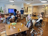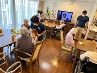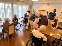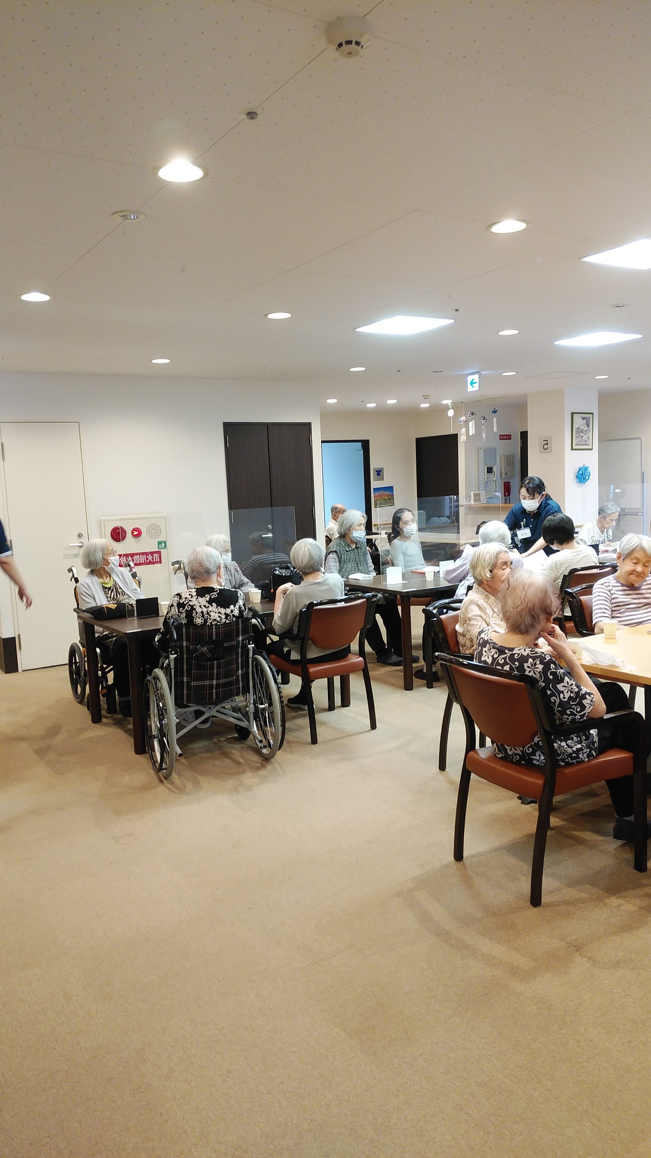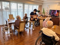 今日の午後はブルースターズの皆さんがみえて演奏してくださいました。利用者様も楽しみにしていた慰問の方々です。1曲目は「ひまわり娘」から始まり新曲の「つぐない」「恋の罠」「瀬戸の花嫁」と6曲を演奏し歌ってくださり皆さんも口ずさみ歌っているのが分かりました。そのあとは演奏曲を3曲、続けて「愛燦燦」「川の流れのように」などもどんどんと歌われてみなさんも手拍子をしたり、足でリズムをとったりと楽しまれていました。アンコールにも応えてくださり「愛して愛して愛しちゃったのよ」で締めくくりました。利用者様、スタッフ共にとても素晴らしい時間でした。次回も楽しみにしたいと思います(^^)/