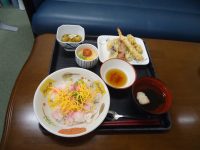 ちらし寿司・天ぷらの盛合せ・茶碗蒸し・焼きナスです。