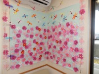 秋桜(コスモス)・・・・・季節は夏から秋に変わりゆく中で、色とりどりのコスモスが咲き始める頃です。お花紙と紙テープを使って花びらを表現しました。コスモス畑の上のほうには可愛らしいトンボが連なって飛んでいます。羽は艶のある折り紙で作りました。