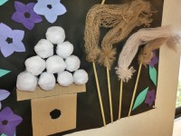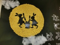 お月見・・・・・・・・・・日本の童謡の一つである「うさぎ うさぎ」は、わらべうたとしても知られています。十五夜のお月さまの中では、うさぎさんが餅つきをしている様子を表現しました。お月さまはお花紙を一つずつ丸めて満月を作りました。すすきの穂は毛糸を使って、まるで風になびくような感じに仕上げました。お月見団子も美味しそうに飾ることができました。