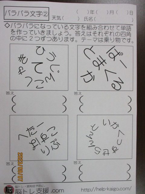 明日のあたまの体操の問題を紹介します♪ こちらは『バラバラ文字』です。バラバラの文字の中に二つの乗り物が隠れています♪ バラバラの文字を組み立てて答えを探しましょう(*´▽`*)