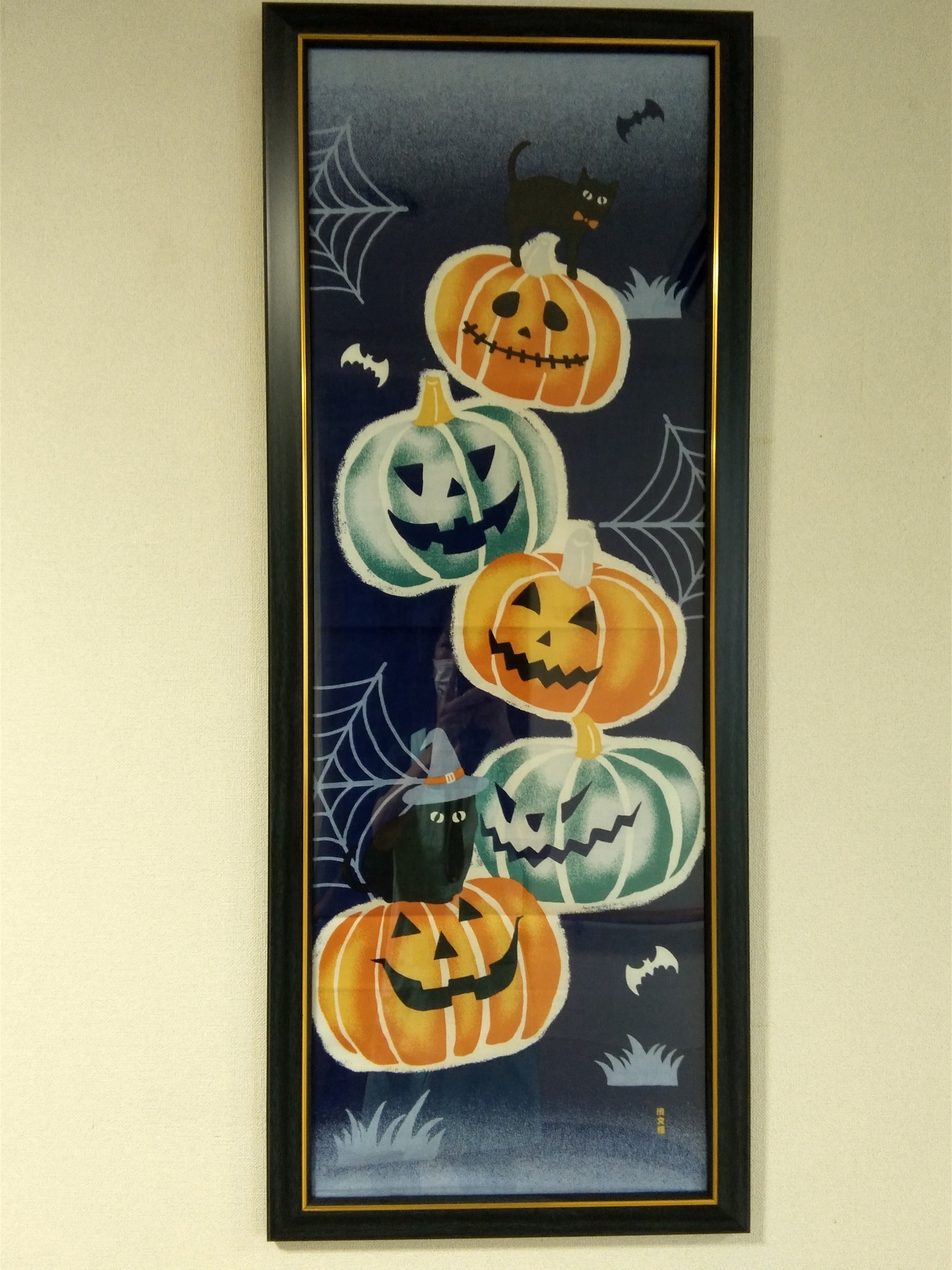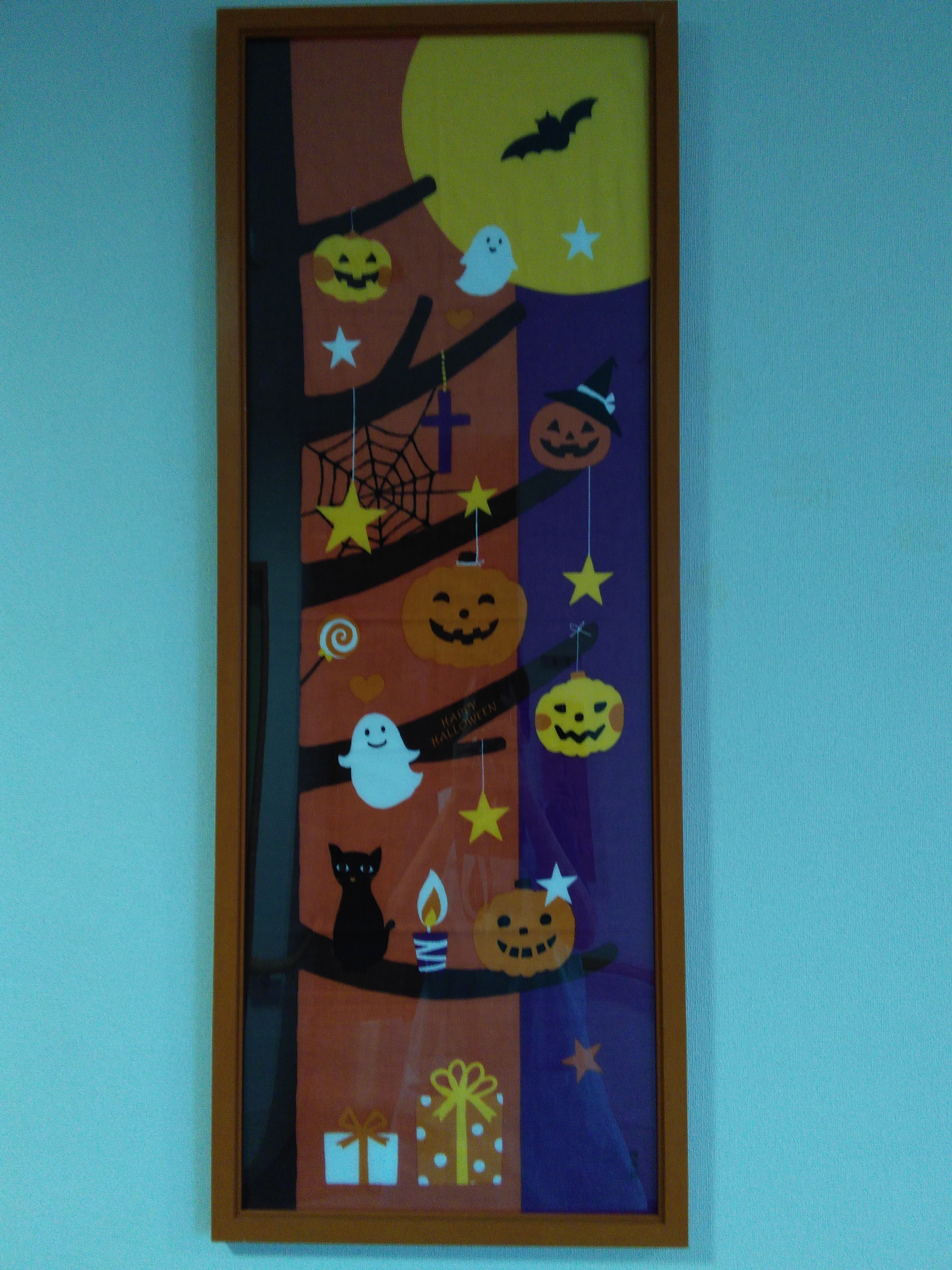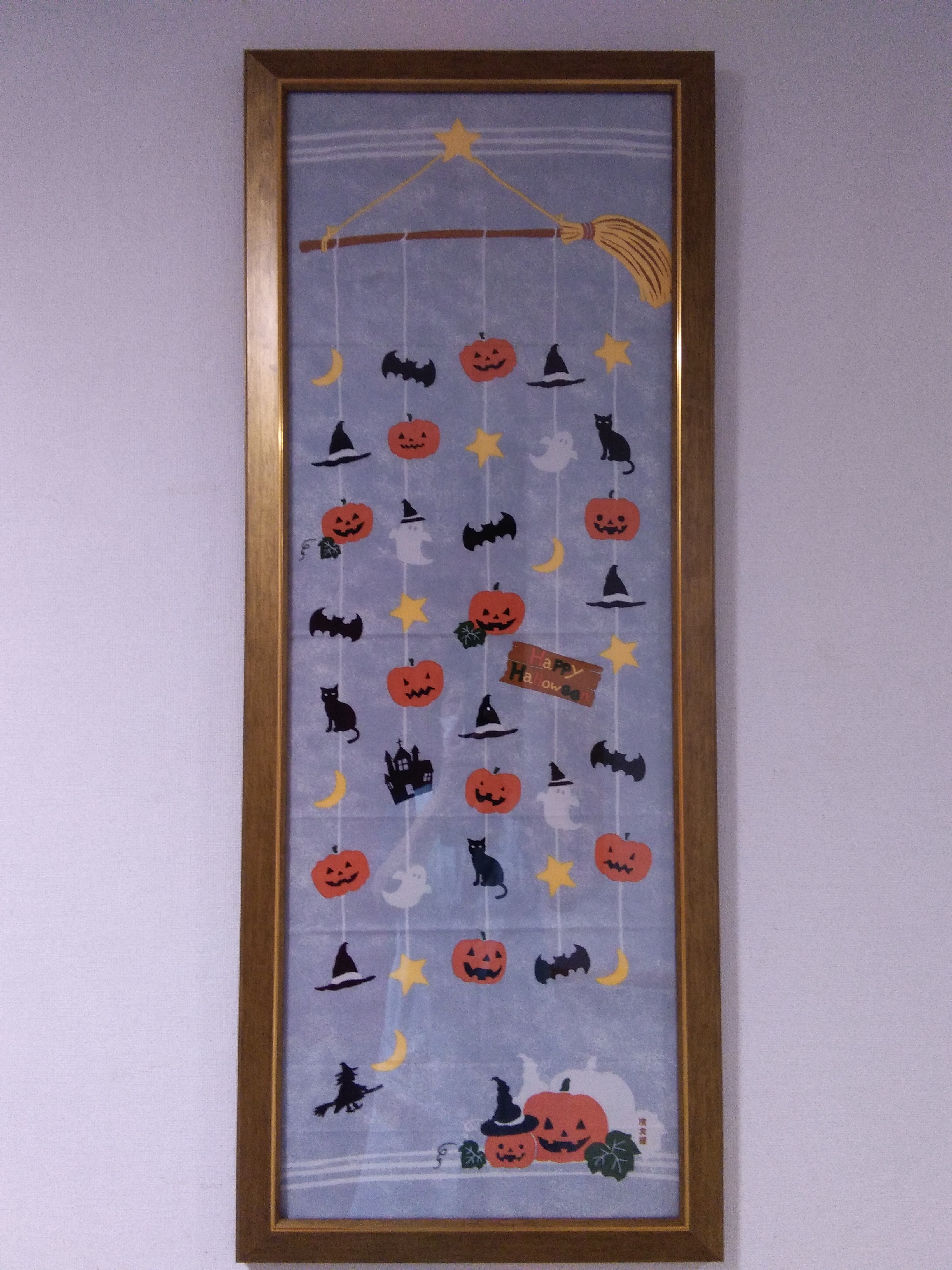 エレベーター横の壁飾りの手ぬぐいを、秋仕様に