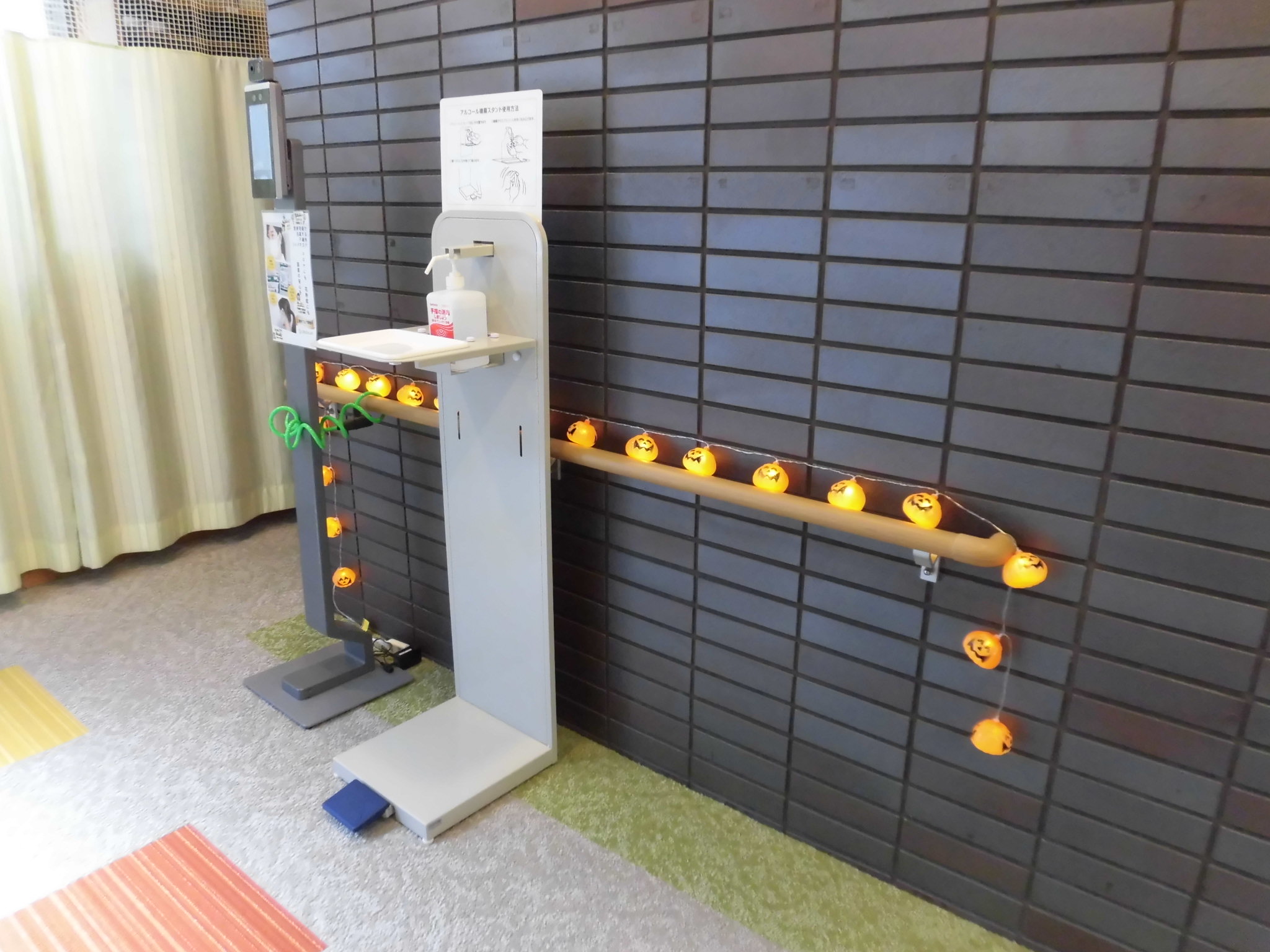 体温測定器と消毒コーナー付近には、カボチャのピカピカ光るランプもあります。