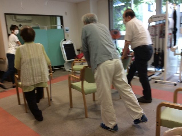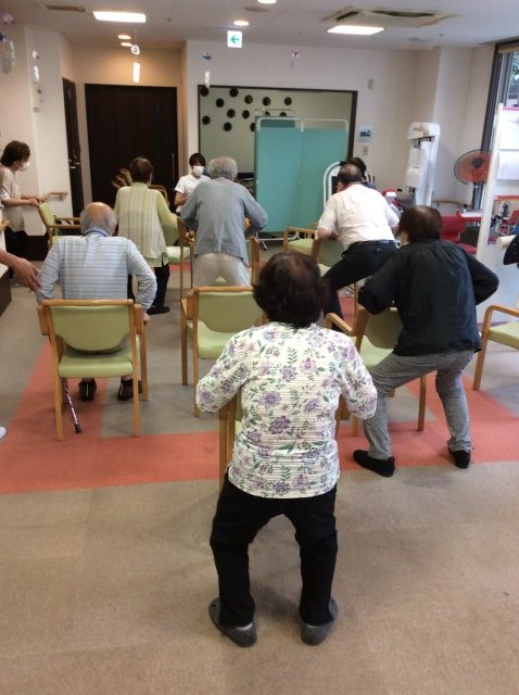 前半はゆったり音楽を聴きながら、職員の動作をまねてご自身で体をほぐしてもらいました。