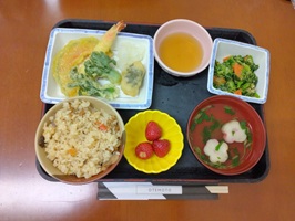 メニューは、桜寿司・清まし汁・えび天・煮物・フルーツです。