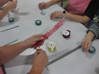 定規にリボンを括り付けて、外しながら巻き付けると(説明が下手ですみません(^^;)お花が完成するんです♪