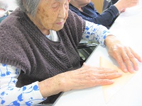 本日は、リンゴや桃・菊の花・ほおづき・きゅうり等のレプリカを見ながら、中には好きなお花を思い浮かべながら絵手紙に取り組まれました。「夏だからひまわりを描こう」「きゅうりのように長く生きよう」と仰り、皆様楽しそうなご様子でした。完成した作品は、おやつを食べながら観賞されました(^O^)お疲れ様でした。