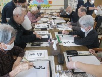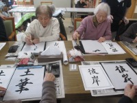 こんにちは、デイサービスです。今日の書道は「弥生」「土筆」「彼岸」「芭蕉」などこの時期にあったお手本を用意しました。「弥生」ひとつを極める方、全部のお手本を一通り書いてみる方など様々です(@_@)皆さんご自分が納得できるものが書けるまで何枚もかいてくださっていました。その中からデイルームに貼る作品をご自分で選んでいただきますが、「どれがいいと思う?」と隣席の方や職員に相談する方もいらっしゃいました。作品が前に貼りだされるとお互いの作品をほめ合うのも敷島デイサービスの書道レクの恒例になっています☺