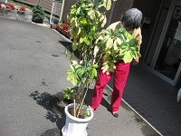 玄関に置いている観葉植物を外に出してお水やりをしていたら、入居者様が手伝いにきてくれました。