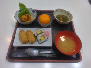 昼食メニューのご紹介です。「助六寿司(稲荷寿司・太巻き」「味噌汁」「あじなめろうフライ」「めかぶとトマトの和え物」「フルーツ」が提供されました。食事には力を入れております。美味しい物を食べると元気になりますよね♪
