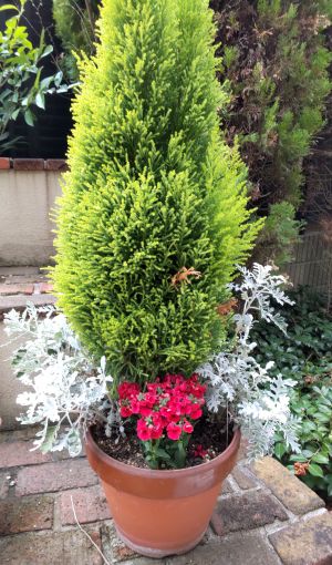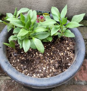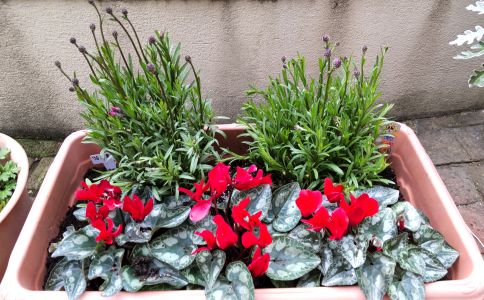 アジサイ、アルストロメリアは単独で一つの鉢に、矢車草はシクラメンの後ろに、ネメシアはコニファーの手前に植え付けました。