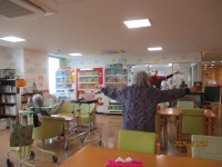 この日は業者さんによる床のワックス掛けがあり、お部屋の清掃が終わるまでホールで待っていた入居者様がいらっしゃったので、カラオケしながら体操をしました。