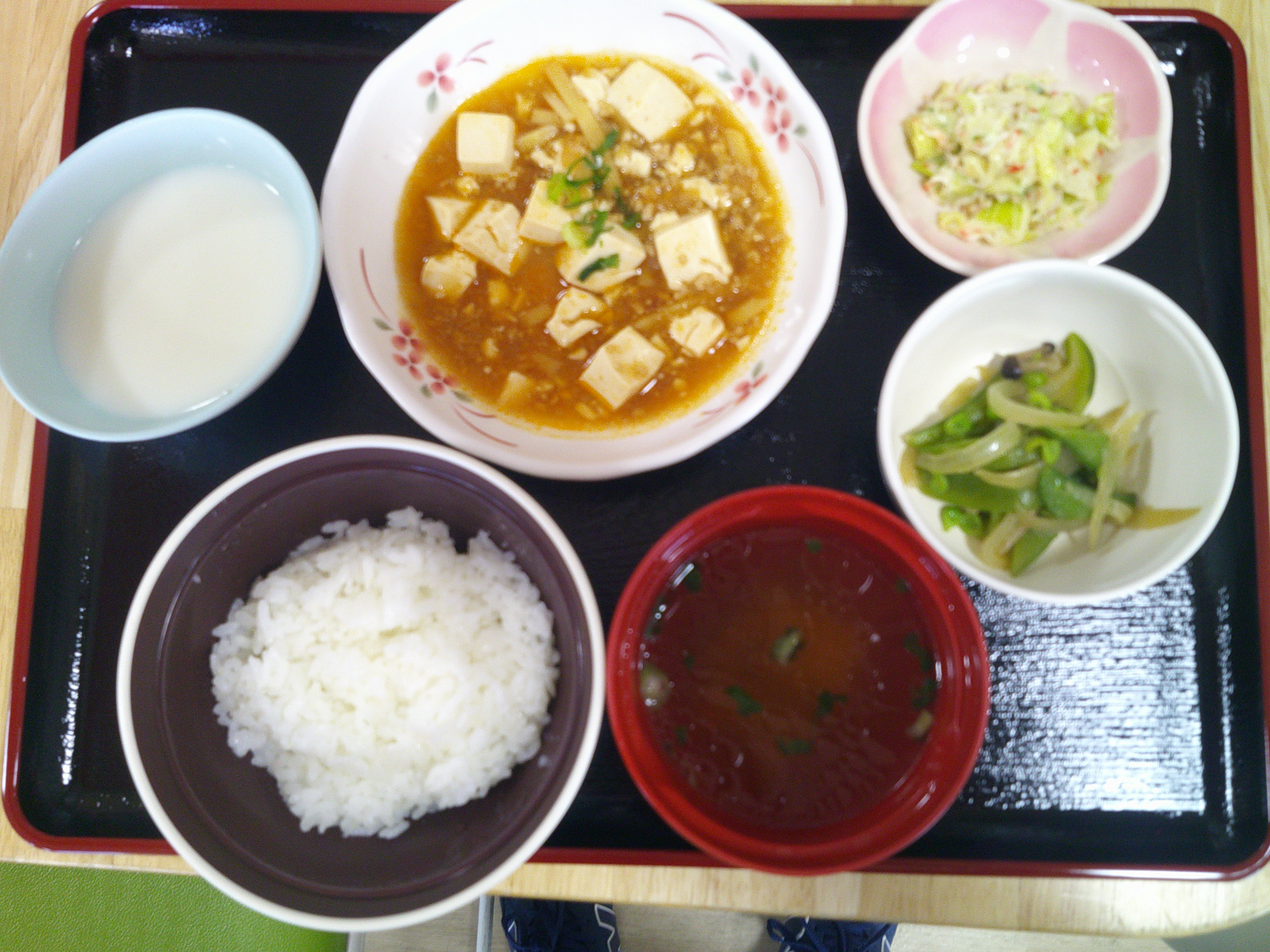 献立のメニューは、豆腐ハンバーグ和風あんかけと筍の土佐煮、海藻サラダです。