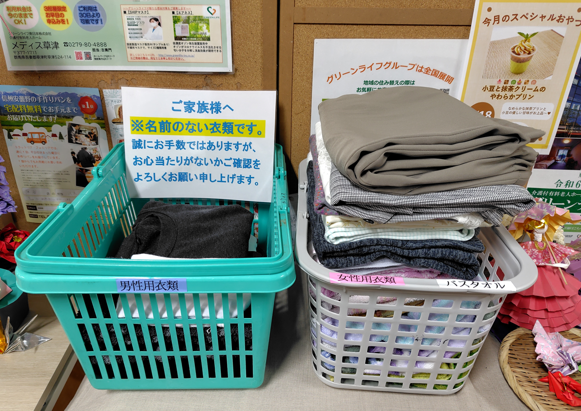 無記名の衣類が事務所入口付近に置いてありますので、面会などでご来設の際に心当たりあればご確認ください。