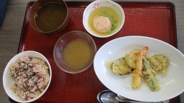 メニューは、お赤飯・味噌汁・赤魚の粕漬け焼き・カリフラワーのおかか和え・果物でした。