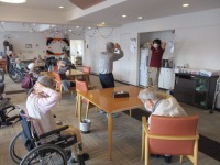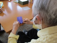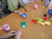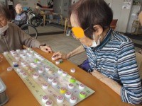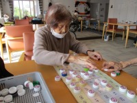 フロアにて談笑されているお二人に数字パズルゲームを提案しました。1から100までランダムに振られたマス目にペットボトルのふたに同様に1から100まで番号を振り、マス目に置いていくゲームです。今回は共同作業でしたがお一人でタイムを競ったりするなど様々な方法があると思います。何度も繰り返しながら活性化を目指していきましょう!