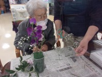 こんにちは、デイサービスです。今日はフラワーアレンジメントを行いました♪ お花屋さんが届けてくださるお花、今日はピンク色と紫色のスイートピーとカスミソウでした。BGMに松田聖子さんの「赤いスイートピー」を流しながら、ご利用者の皆様真剣な表情でお花を生けて下さり、好きな色の包装紙とリボンで綺麗に仕上げていました。