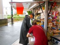 ちょうど、とくし丸が来る時間になって雨脚が強くなり、施設入り口前はタイル張りの為