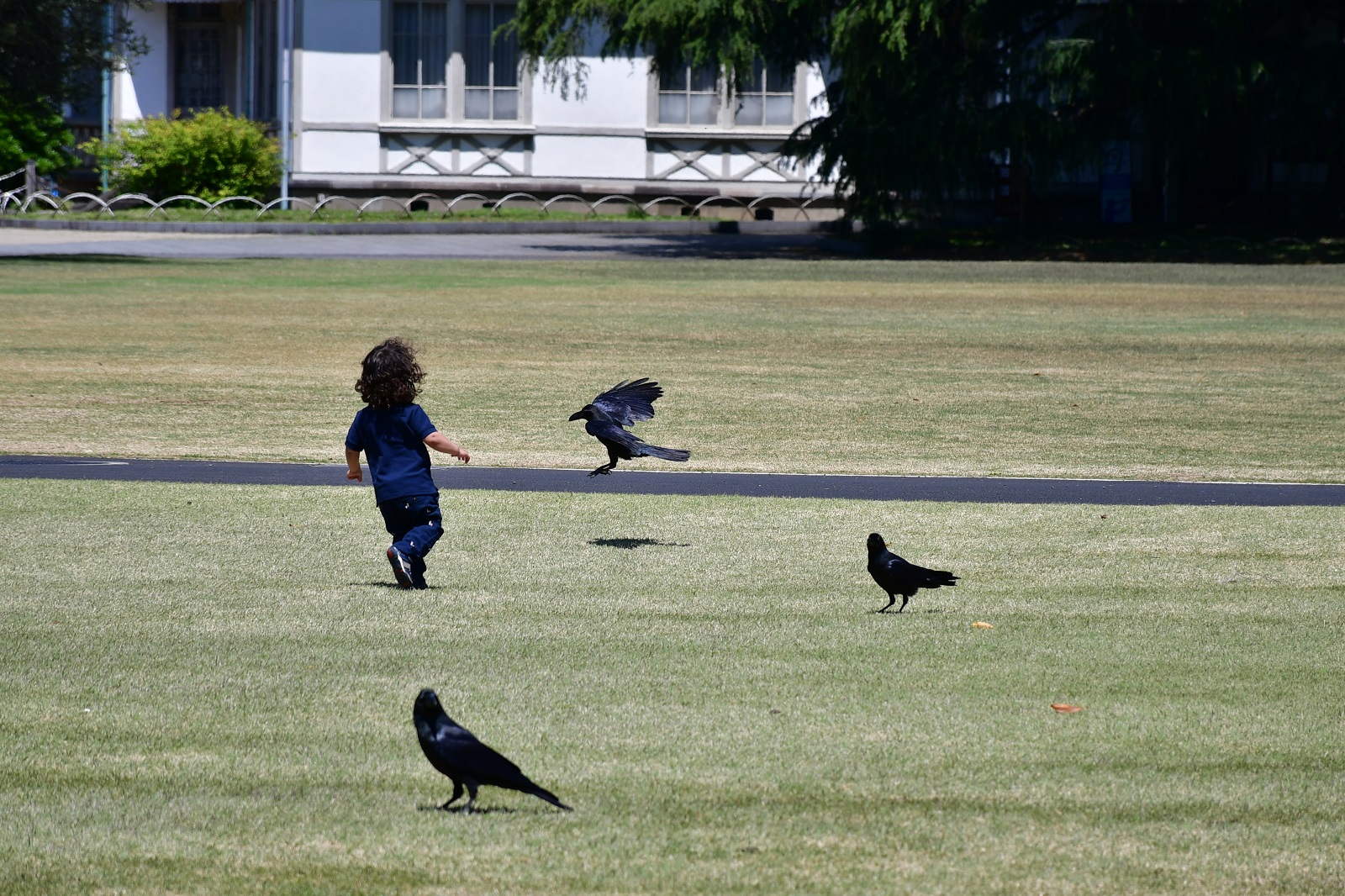 子どもが無邪気にカラスを追いかけている様子を入居者様もスタッフ一同も