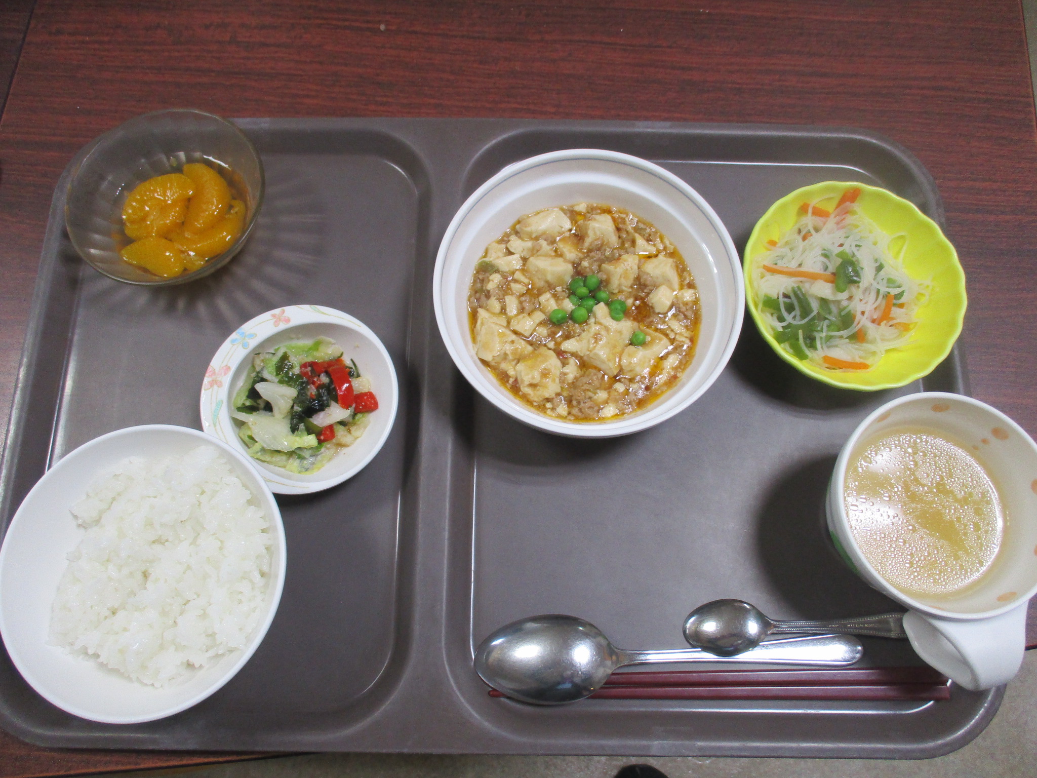はぴね横浜:本日の昼食は麻婆豆腐、ビーフン炒め、中華和え、フルーツ、スープです。