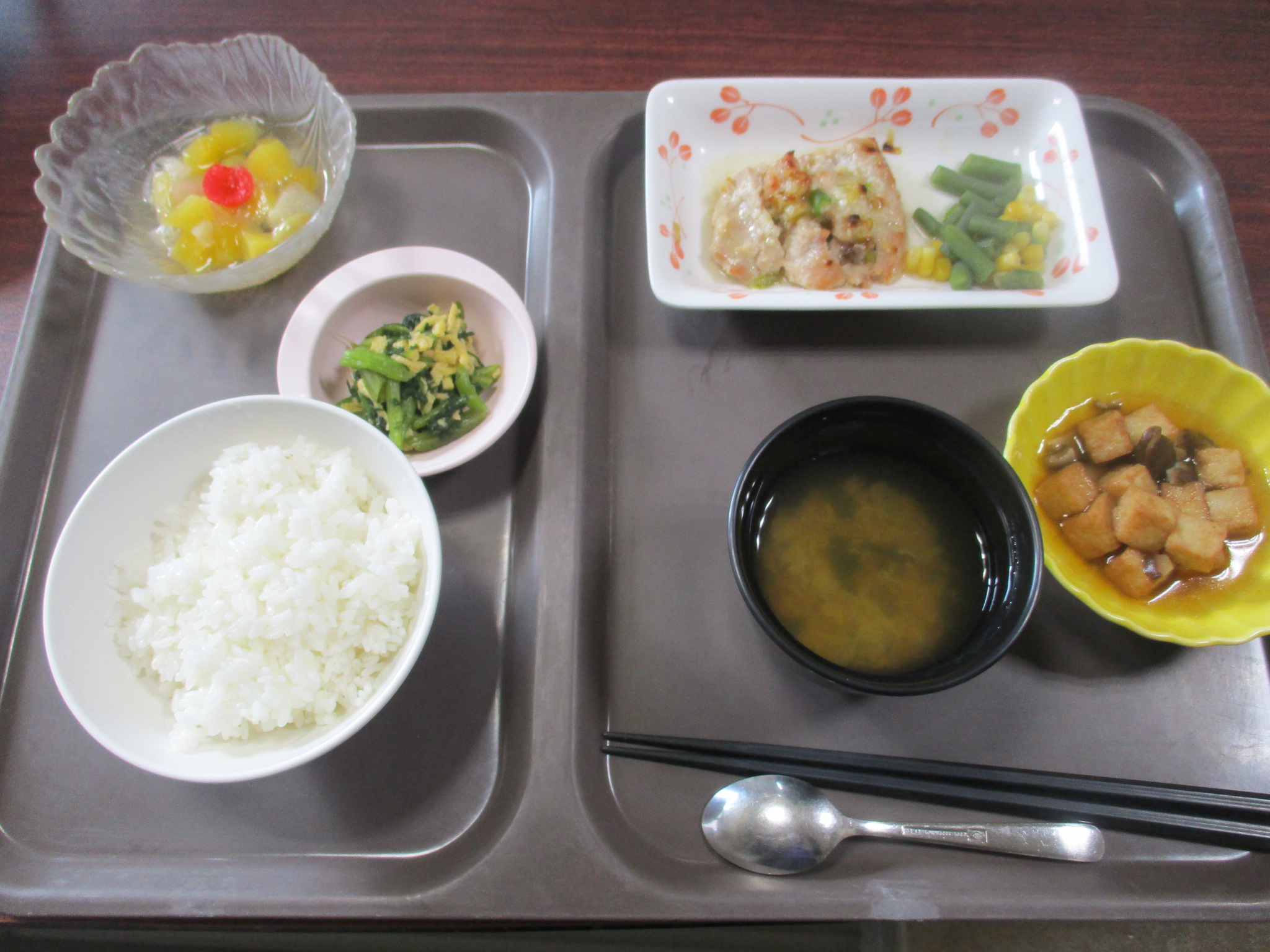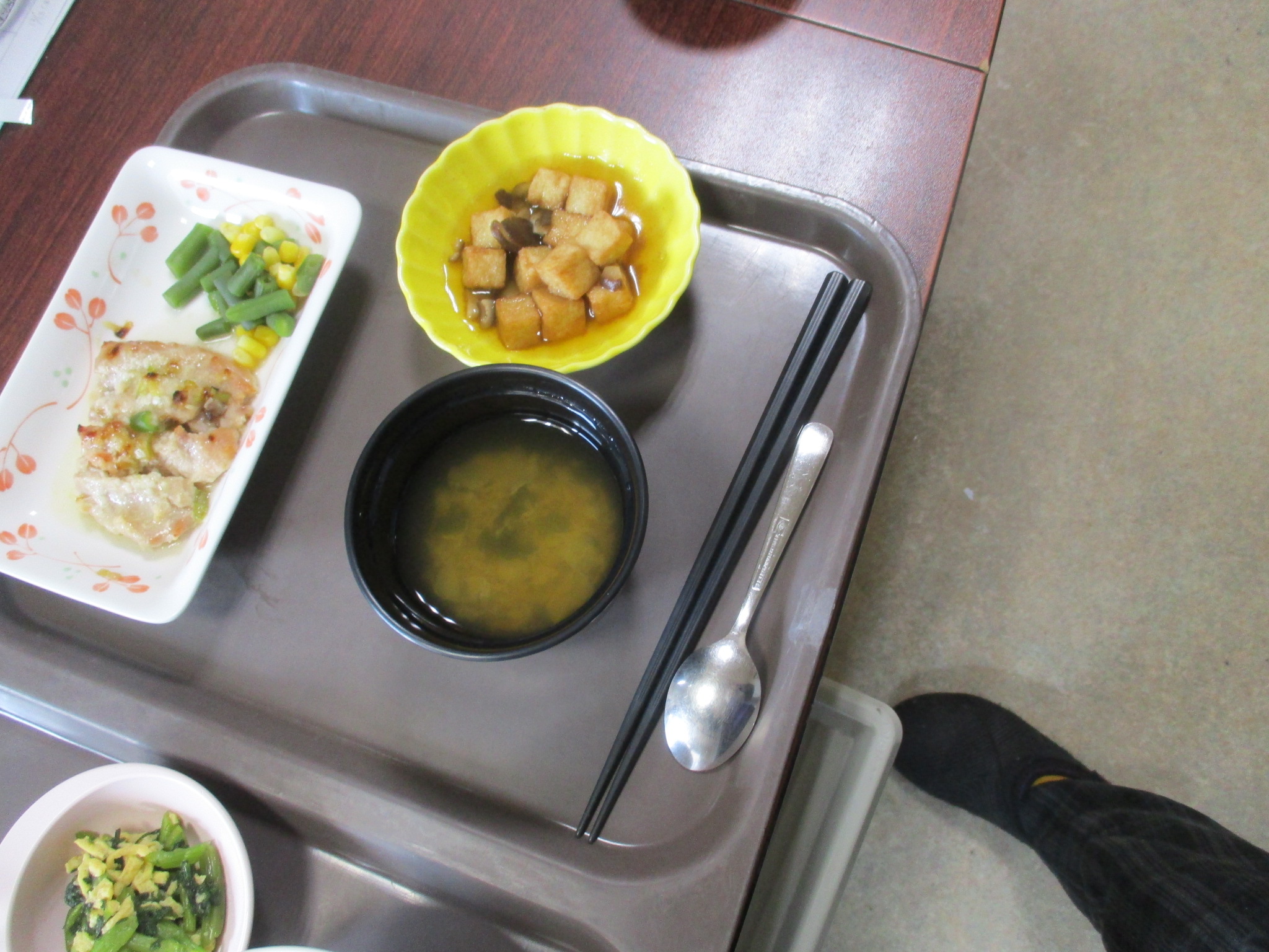 はぴね横浜の本日の昼食は、鶏肉の塩麴焼き、キノコと厚揚げの煮物、錦糸和えです。
