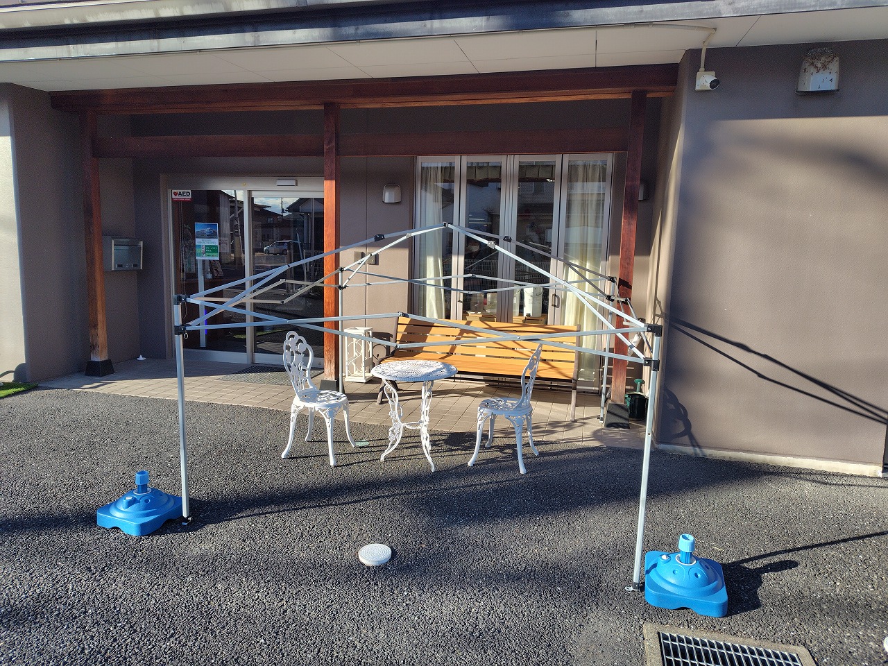 施設前に面会用のテントを設置していたのですが、飛ばされても困るので一旦骨組みを残して撤収しました。