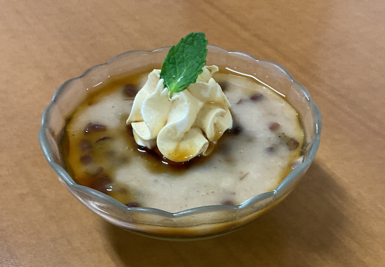 小豆と生クリームをトッピングした抹茶プリンでした❕