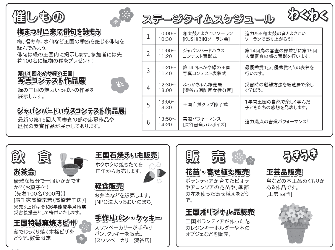 3月2日に第16回梅まつりがふかや緑の王国(施設から車で10分くらい)で開催されるようです。