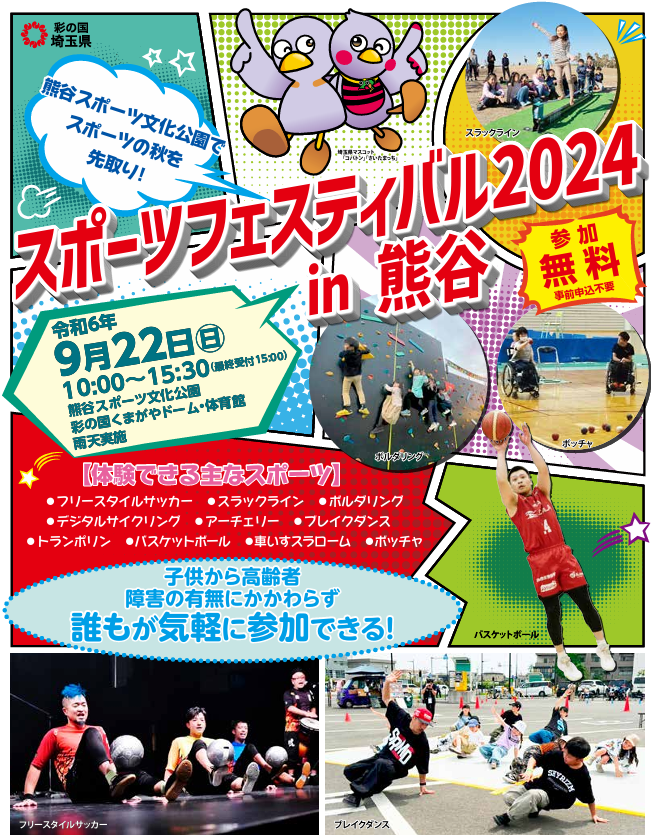 多彩なスポーツを楽しむ機会を広く県民の皆様に提供し、更なるスポーツの普及とスポーツを通じた共生社会の実現を目的とした「スポーツフェスティバル2024 in 熊谷」を開催します。