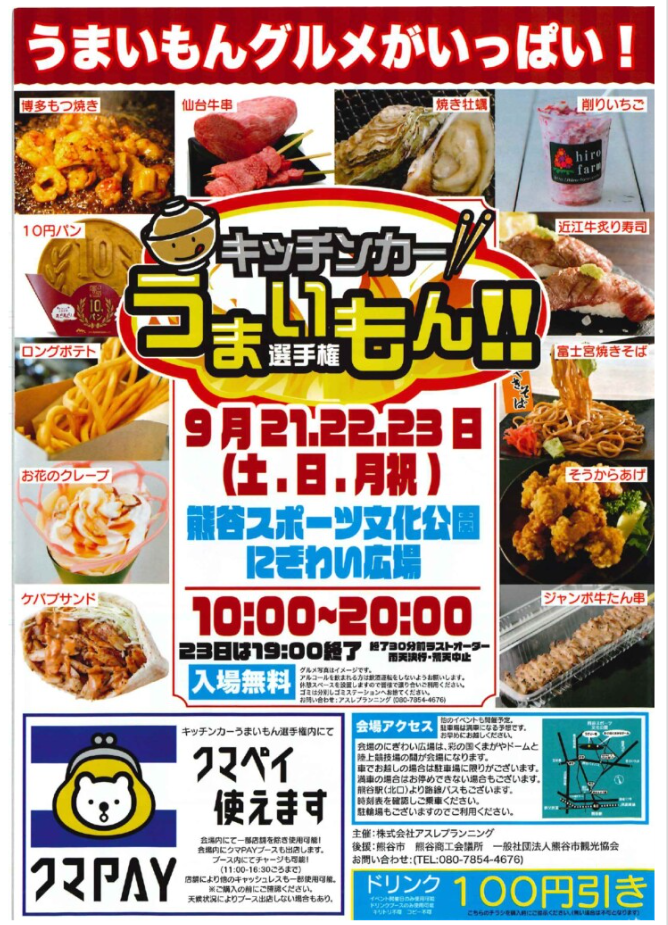 キッチンカーうまいもん選手権が熊谷スポーツ文化公園内のにぎわい広場で開催されます。