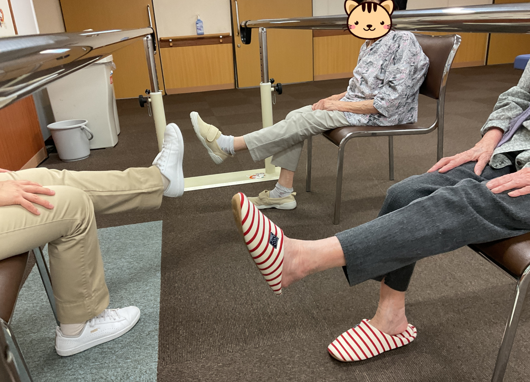 まず椅子に座った状態から片足をピーンと前に伸ばし、つま先を真上に立てて、戻してを繰り返しです。それを交互にやります。