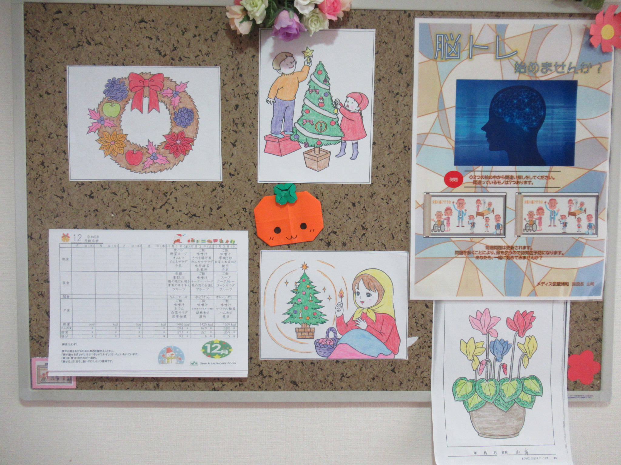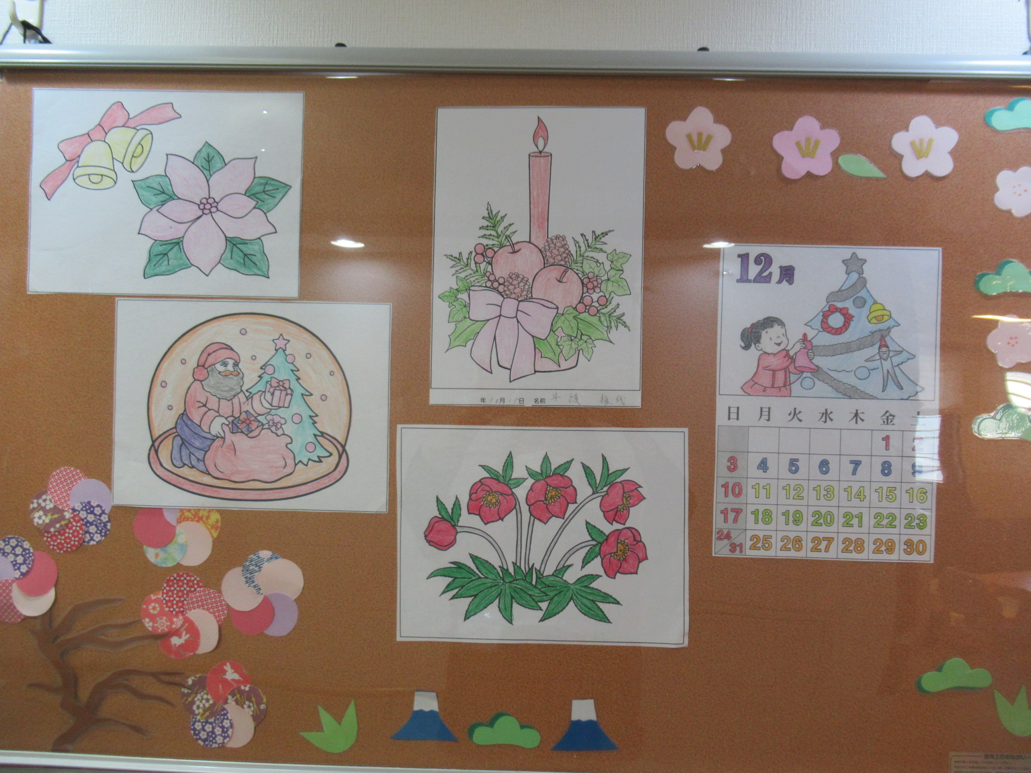 クリスマスのぬり絵がおおく、施設内がクリスマスカラーになりました。