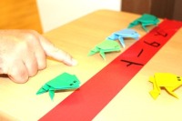 このカエルさん、おしりを指で押さえて弾くようにすると、ホントのカエルみたいに飛び跳ねるんですね。