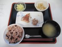メニューは、お赤飯・味噌汁・赤魚の粕漬け焼き・カリフラワーのおかか和え・果物でした。