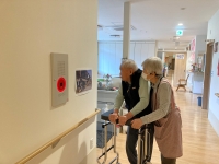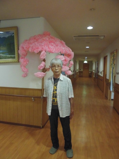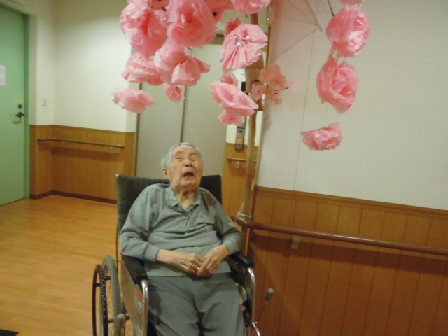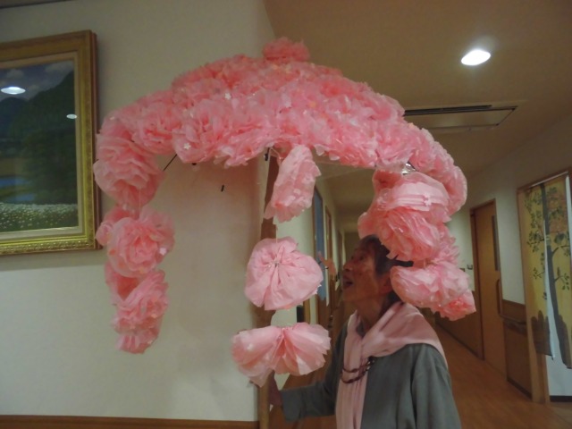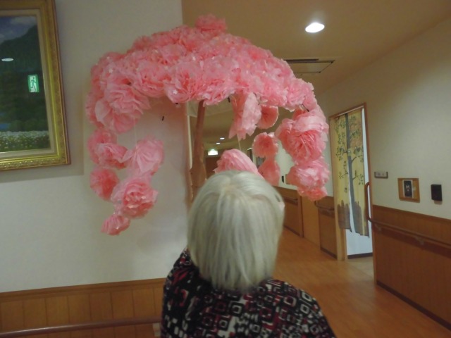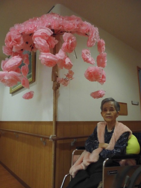 ご入居者の皆様が一生懸命、作成してくださった桜を合体させ素敵な『映えスポット』が完成致しました‼しだれ桜が見事に咲いております(*^-^*)今日から3階で1週間、その次は2階に移動します✨✨3階の皆様が今日は記念撮影📷✨こちらにお越しの際はぜひご覧になってください(^o^)/