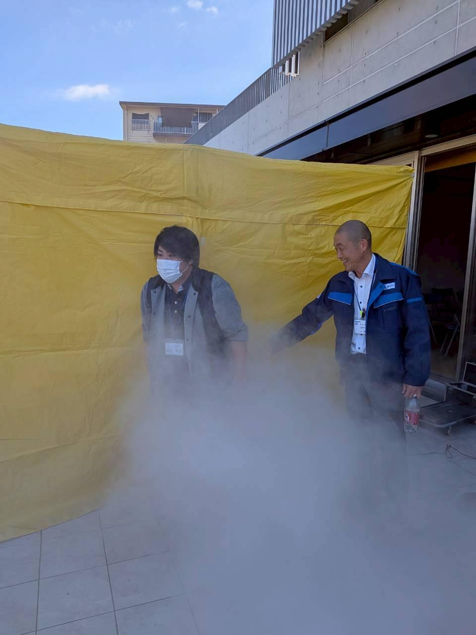 「これから避難訓練を行います。皆様慌てずゆっくり避難してくださいね。」