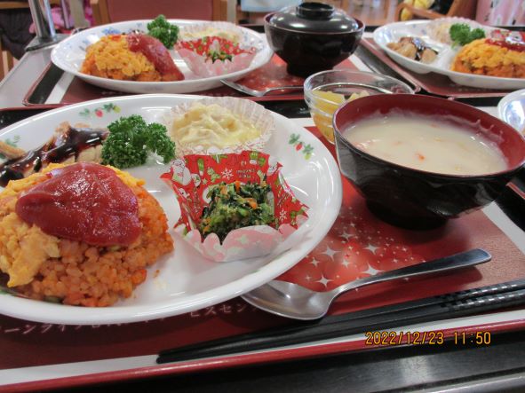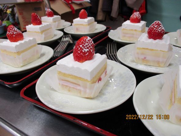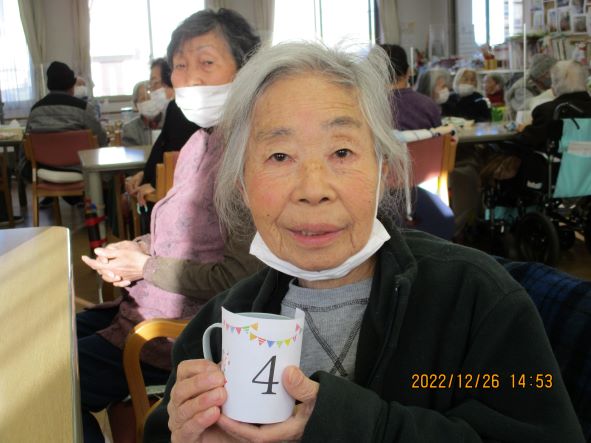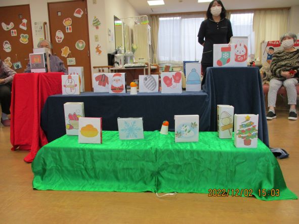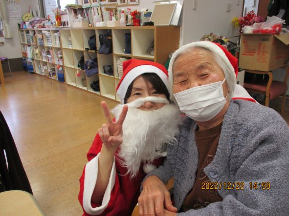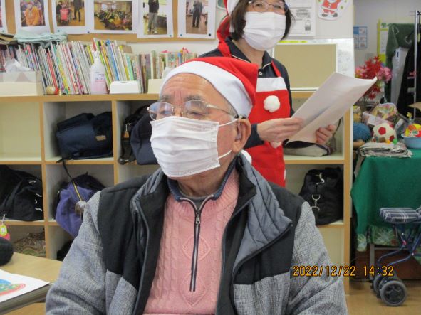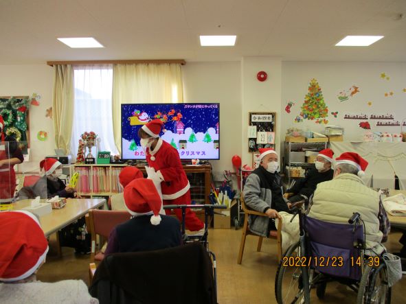 皆様にサンタの帽子をかぶって頂きクリスマスの歌を唄い楽しんで頂きました。サンタも登場しプレゼントを配ってくれました。