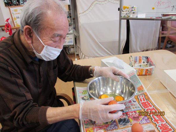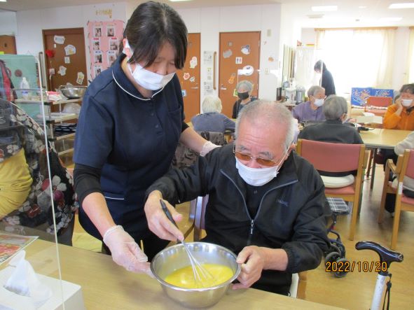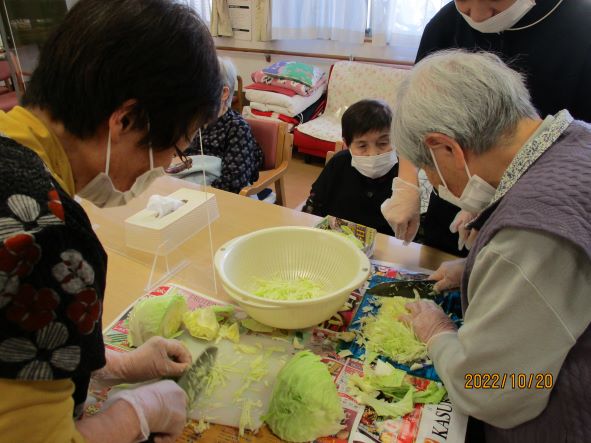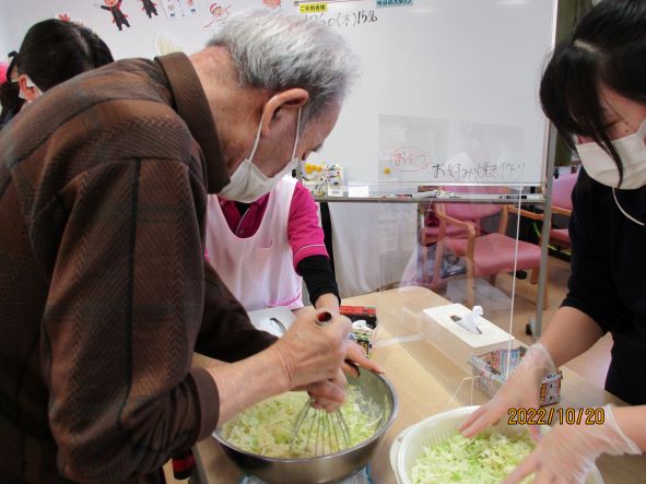キャベツや紅ショウガ、ちくわなど細かく切ってもらい男性には粉を混ぜる力仕事を行ってもらいました。