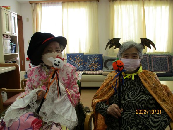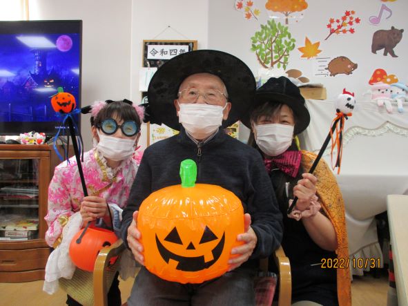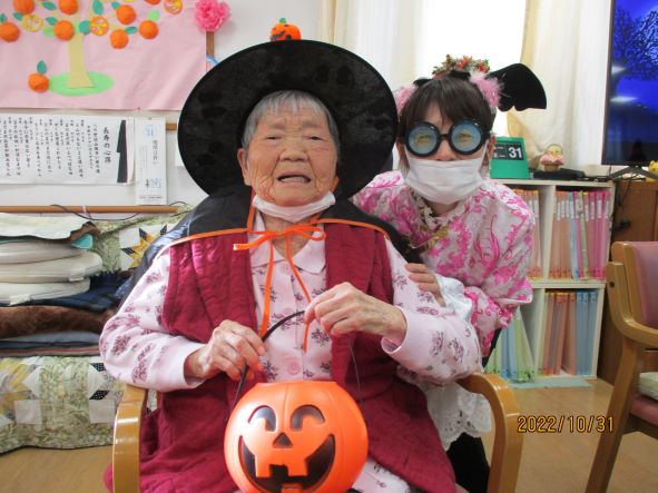 「トリックオアトリート」と発声練習していたらしたスタッフがいたずらしに来ました。かわいいとの声があがっていたら・・・いたずらなスタッフがご利用者様にも仮装してしまいました!