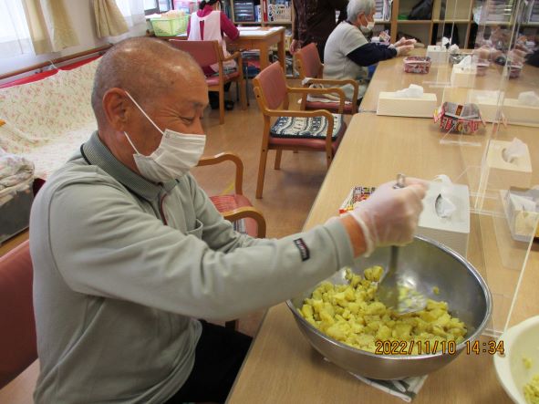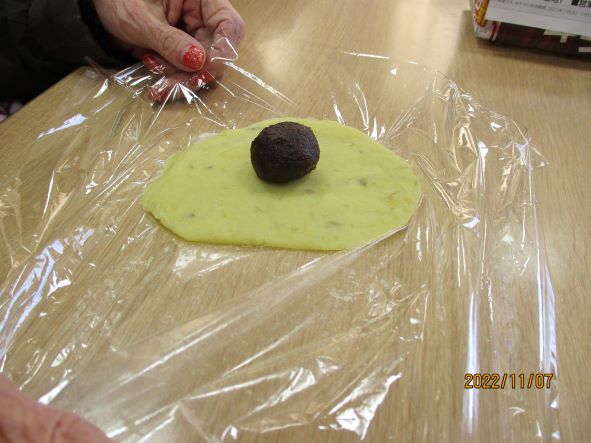 さつまいもを潰すのは力がある男性にお任せして女性にはあんこを丸めてもらいました。