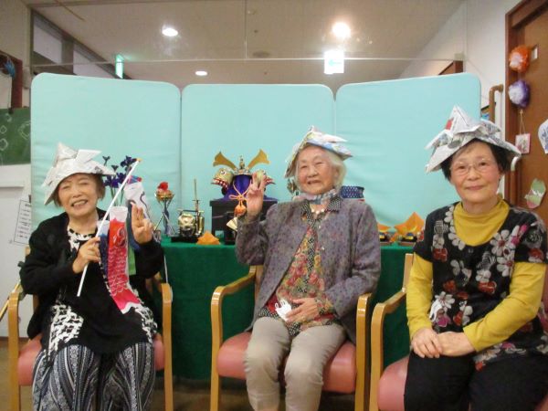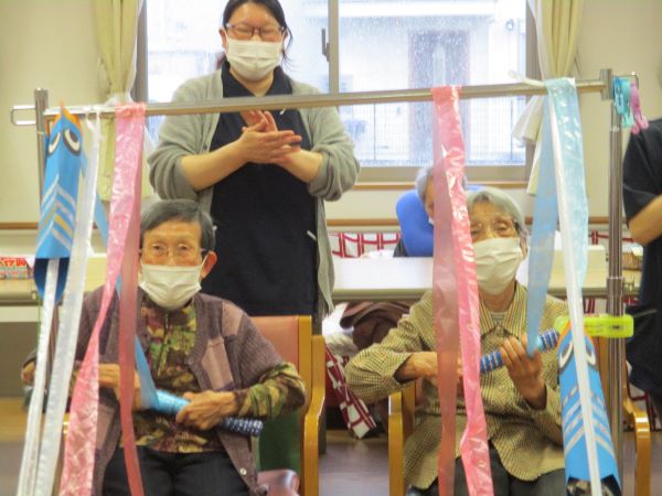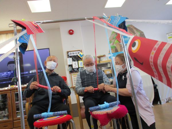 今日はこどもの日、端午の節句なのでお風呂はしょうぶ湯に入っていただき午後は巻き巻き鯉のぼりのレクレーションを行い、兜の前で新聞で作った兜をかぶり写真を撮り端午の節句を満喫しました😄
