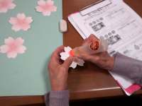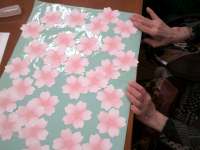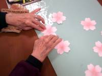 桜のカードを紙に貼っていただき、満開の桜が出来上がりました。折り紙の桜は職員の力作です。