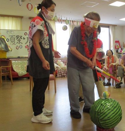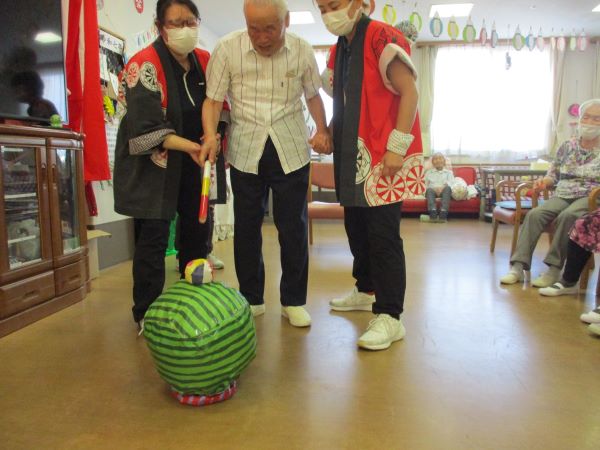 盆踊りやカラオケを行った後は少し休憩をしてすいか割りを行いました🍉
