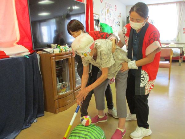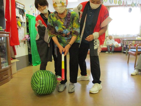 今年は残念ながら本物のスイカは用意が出来なかったのでビーチボールをすいかに見立て代用しおまけに紙風船を上にのせて皆様に挑戦していただきました👏😄