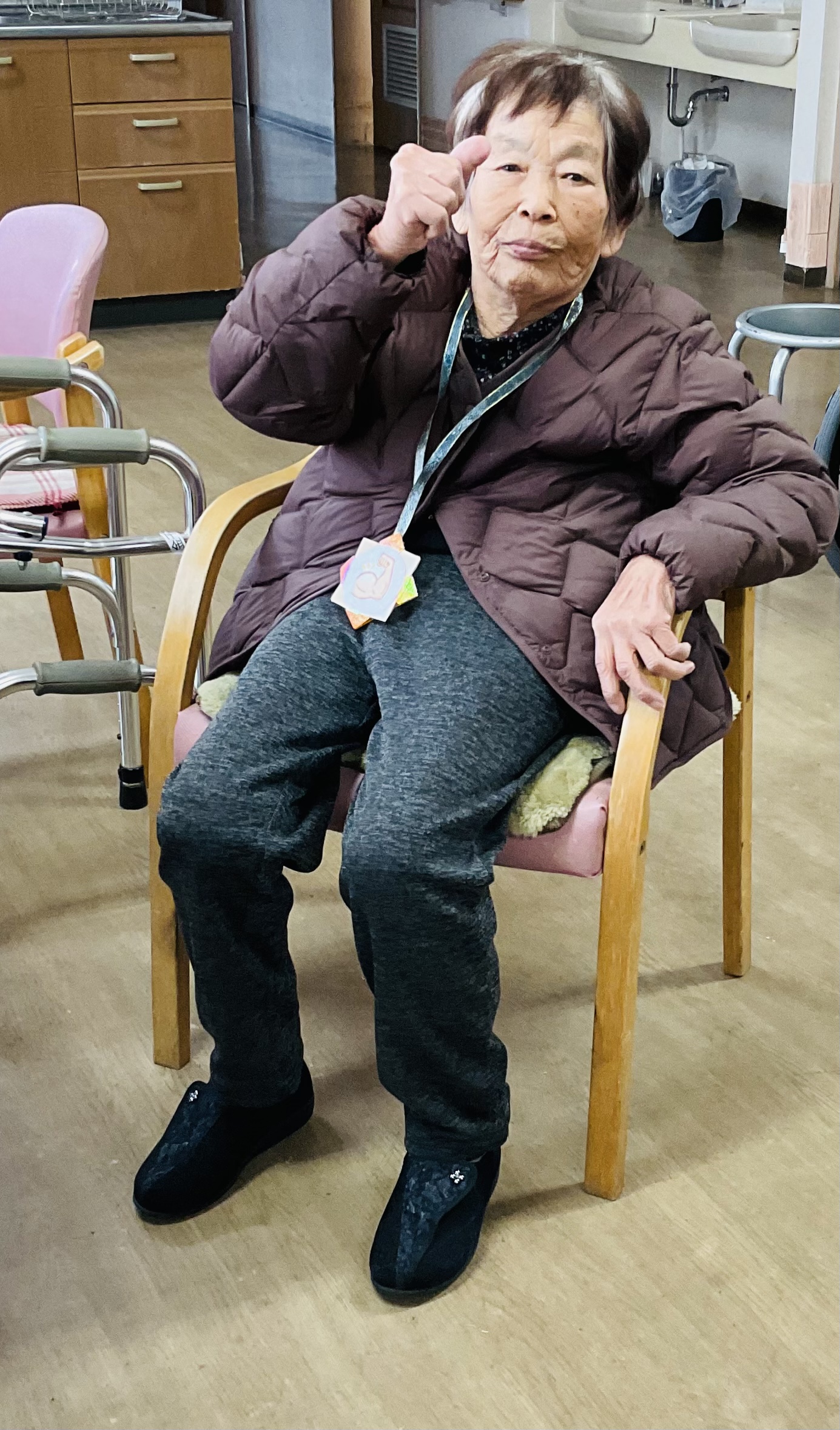 ちょっとした隙間時間に、ご利用者様とスクワットをしています。