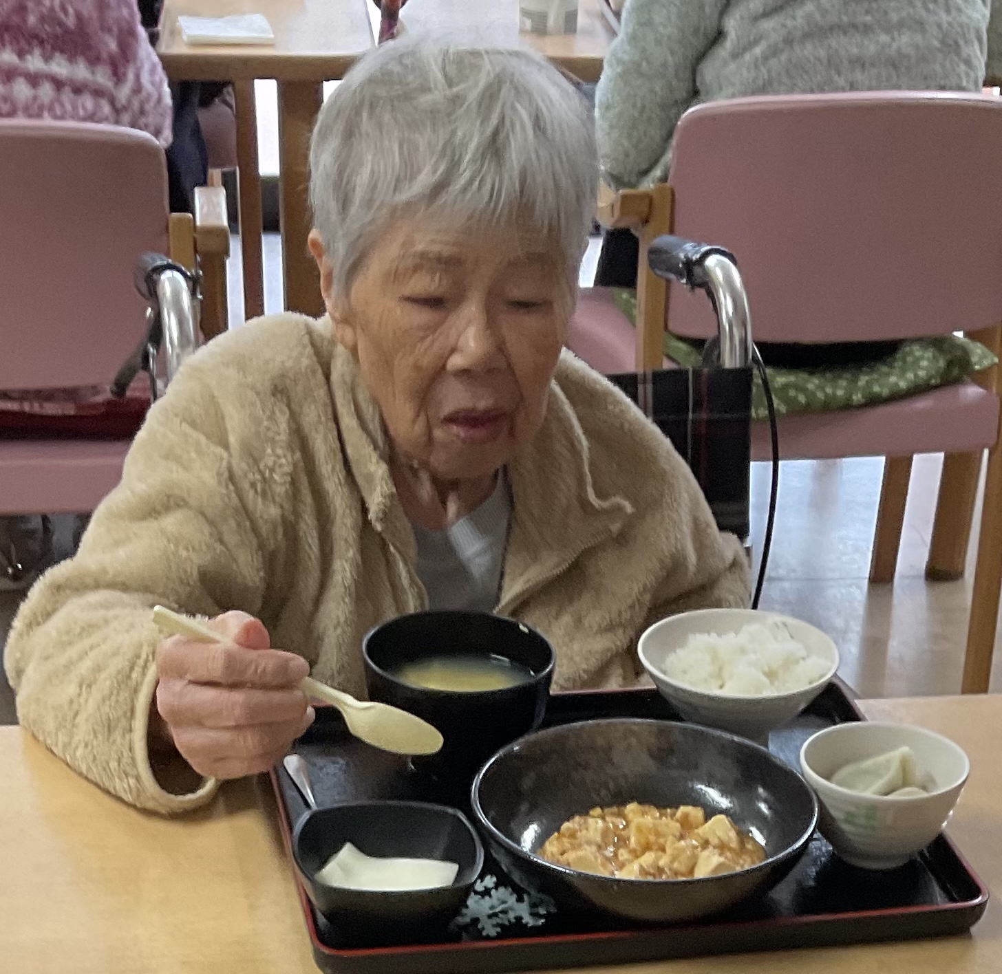 麻婆豆腐、水餃子、卵スープ デザートには杏仁豆腐