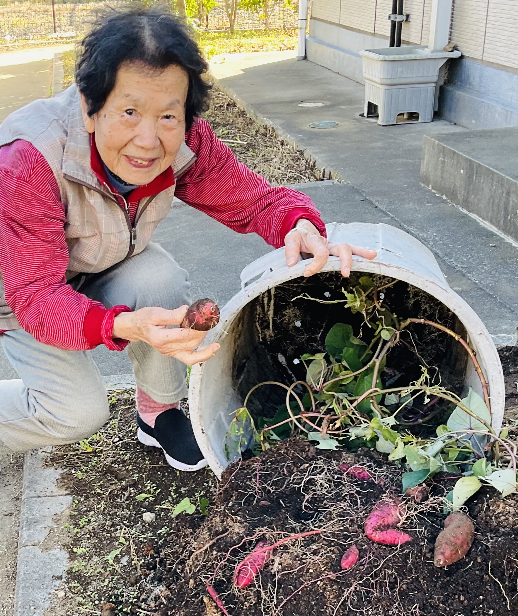 ご利用者様に収穫を手伝っていただき、3時のおやつに蒸して