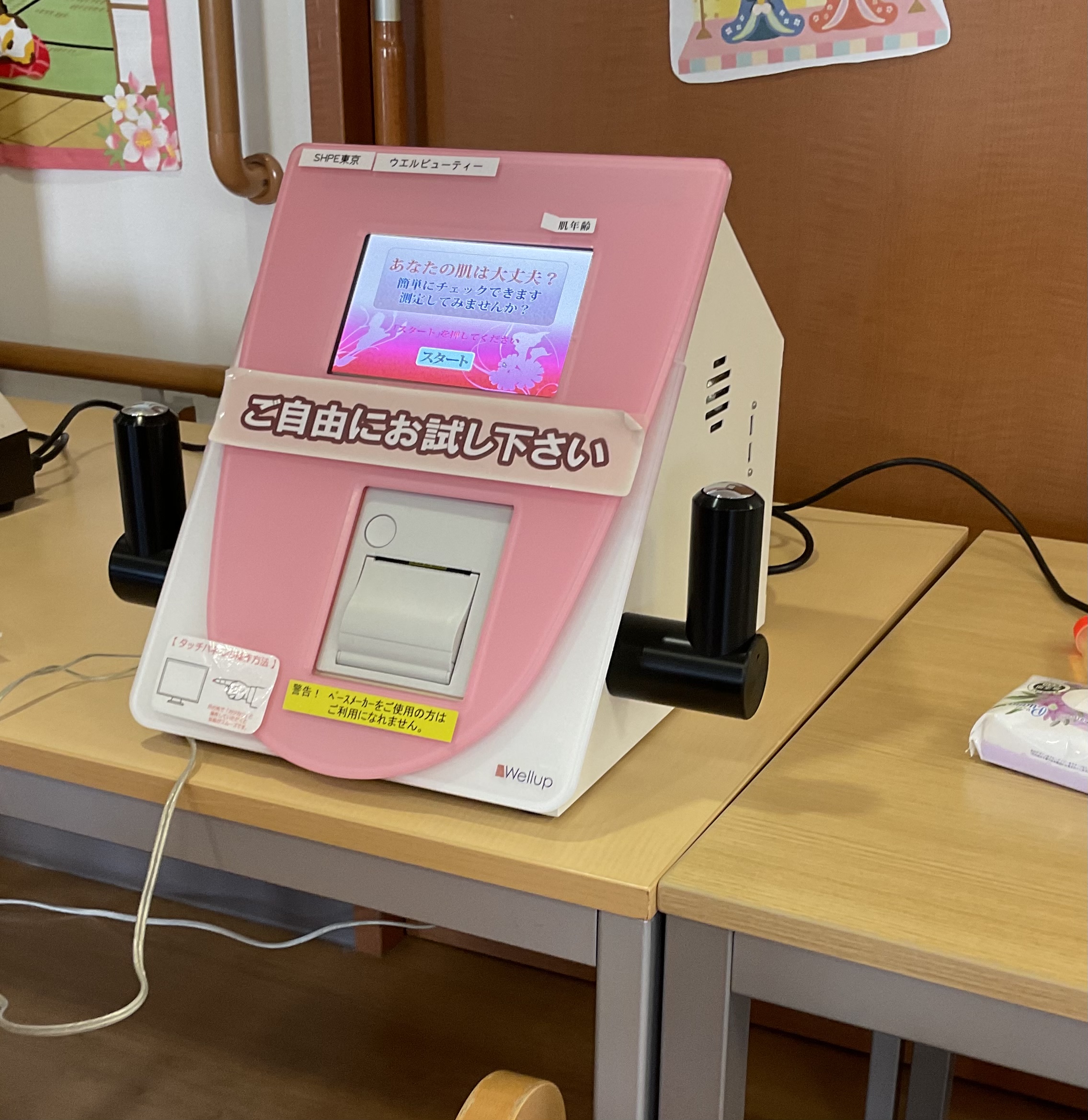 ついでに大きな声で歌って元気になれると言う一大イベントを行いました。肌年齢チエックではチョッピリドキドキです。少しでも若く見られたい!?