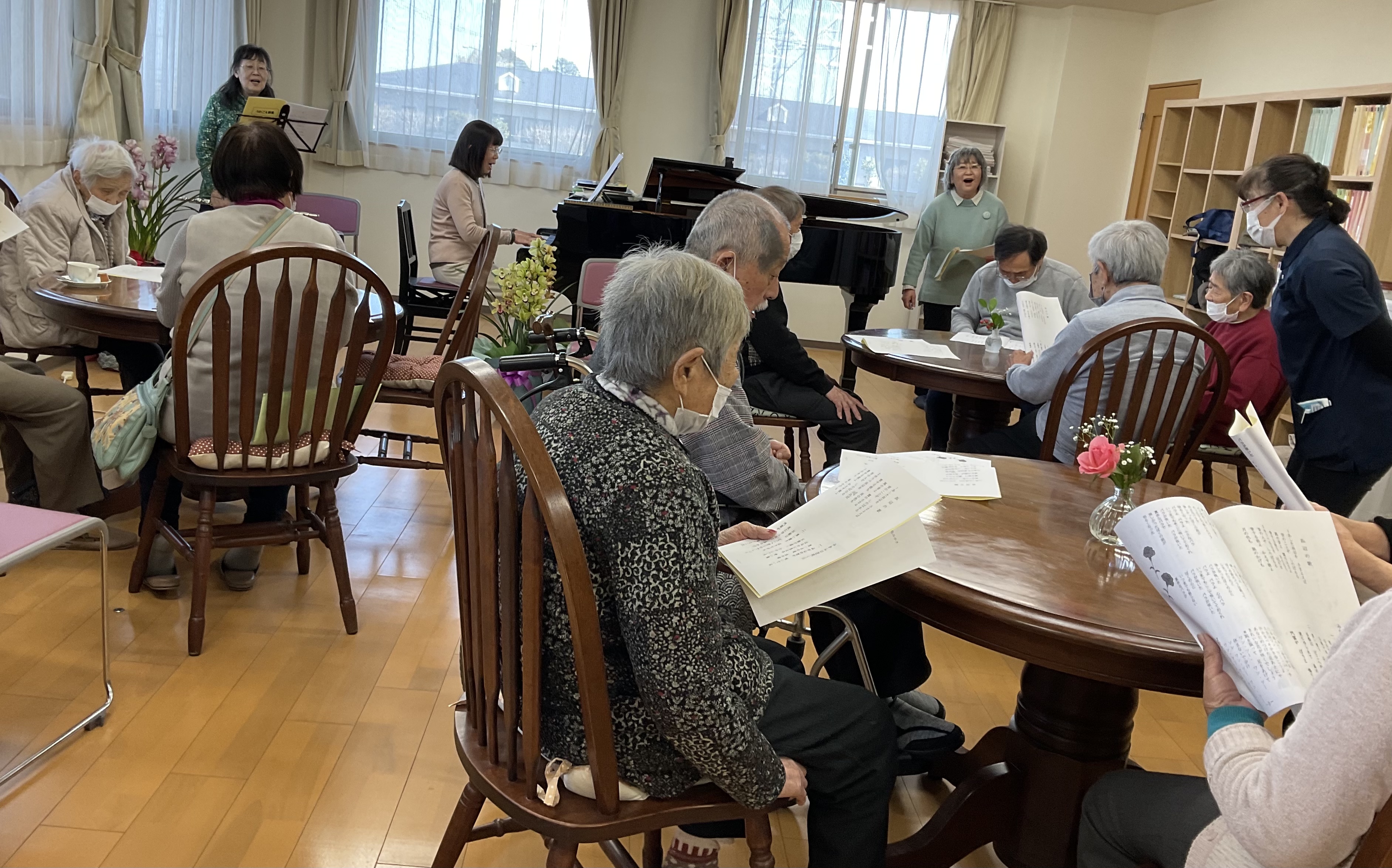 歌声喫茶2日目は、グランドピアノのある部屋を喫茶店風に設定。コーヒーの香り漂う中で、思い出の昭和の歌や唱歌を思いっきり歌っていただきました。